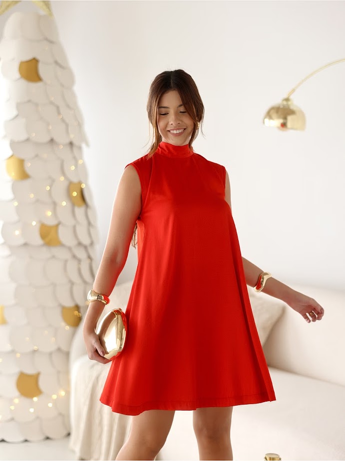 O vestido Babi que combina praticidade e um toque de elegância. Sem mangas, ele oferece um visual leve e arejado, perfeito para dias mais quentes. A gola alta, delicadamente finalizada com um laço, adiciona um ar de sofisticação. O design clean e moderno valoriza a silhueta, tornando o vestido versátil para diversas ocasiões e indispensável para o seu guarda-roupa.